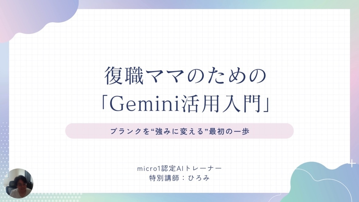 この動画では、復職後の業務がぐっと楽になる Gemini(AI)活用の基本 をひろみ講師がやさしく解説しています。